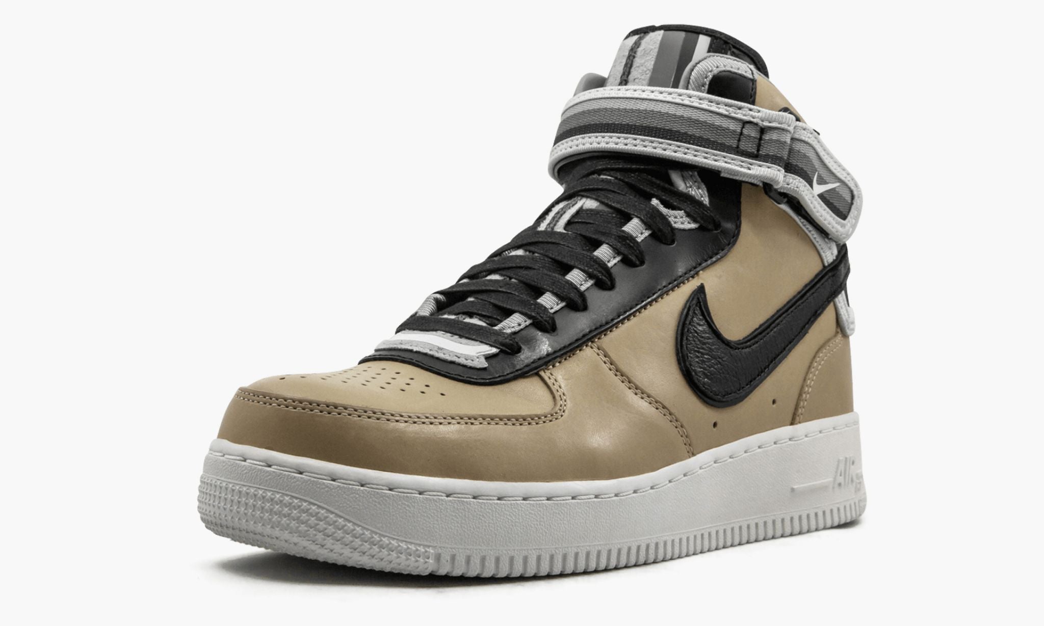 Italian fashion designer Riccardo Tisci teamed up with Sportswear in 2014 for a monumental collaborative collection on the 1 in low, mid, high, and an ultra-high boot edition for just for women. This unisex 1 Mid features a premium tan leather upper with the collection’s signature striped trim in black, white, and grey for one of the most appealing looks of the entire high-fashion set.