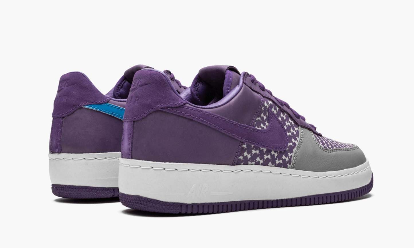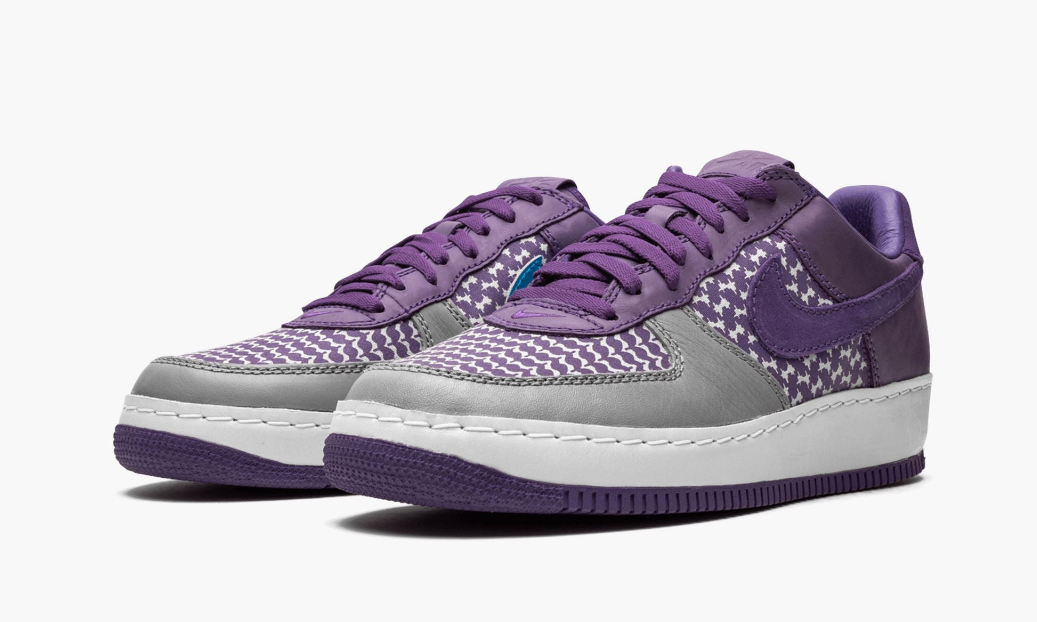 Released in 2006 in collaboration with Undefeated, this 1 Low features a unique pattern on the textile base in purple and white with matching purple leather and grey leather at the toe. One final distinct touch: the medial Swooshes are blue.